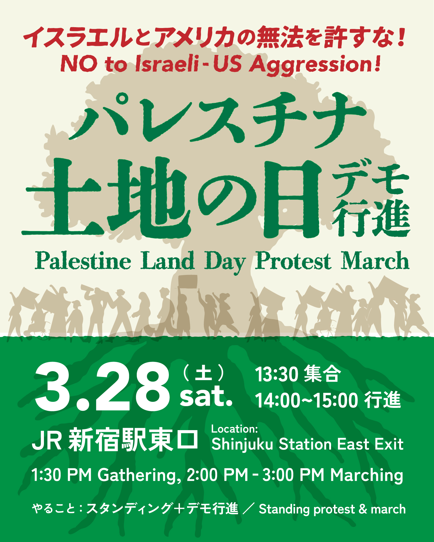 『イスラエルとアメリカの無法を許すな!パレスチナ土地の日デモ 3.28 [スタンディング+デモ行進]』( #パレスチナに平和を緊急行動 )