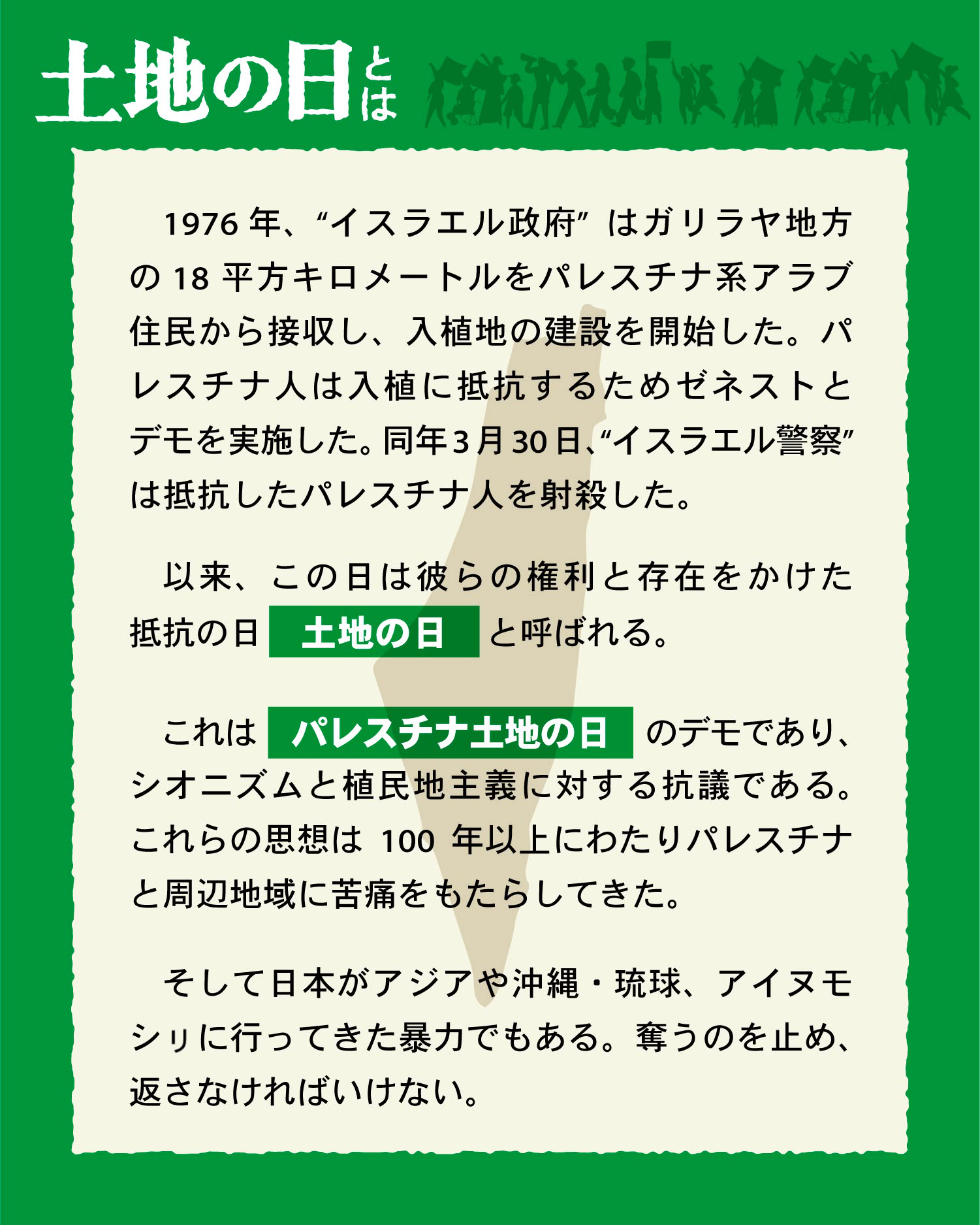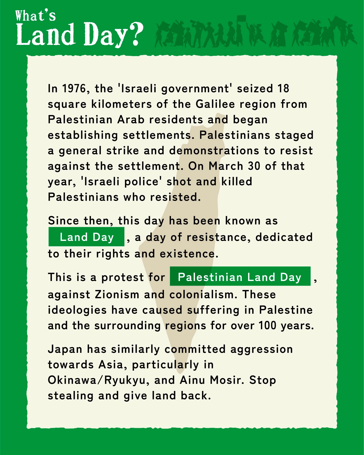 これは「パレスチナ土地の日」のデモであり、シオニズムと植民地主義に対する抗議である。この思想は100年以上にわたりパレスチナと周辺地域に苦痛をもたらしてきた。そして日本がアジアや沖縄、アイヌモシリに行ってきた暴力でもある。奪うのを止め、返さなければいけない。 Japanese description about Land Day.