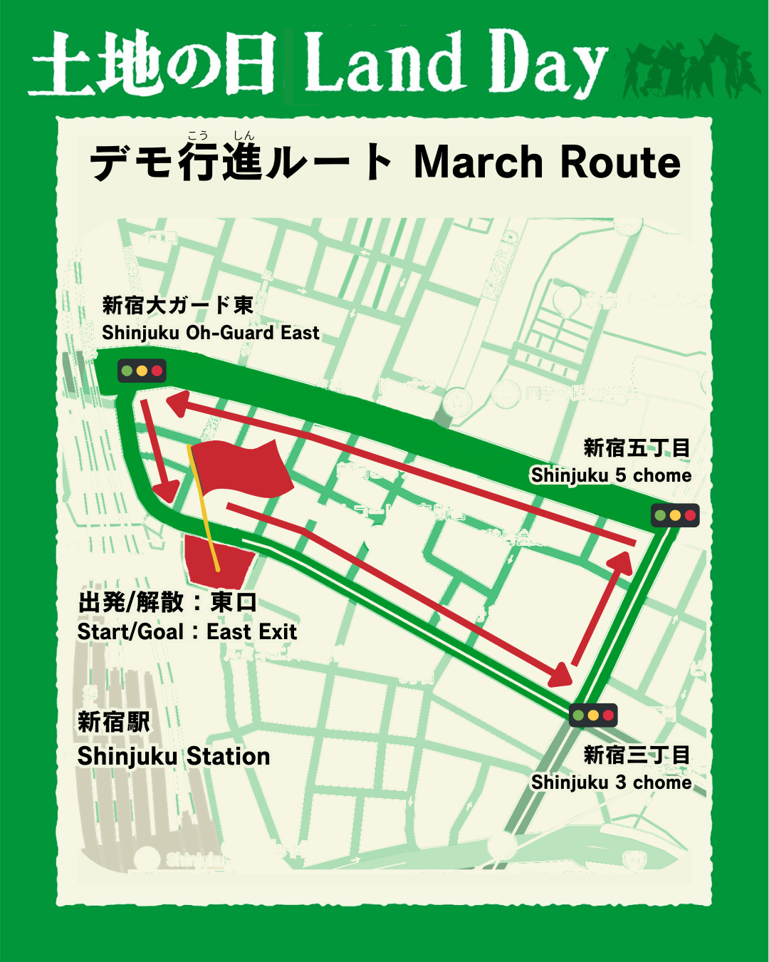 *After the marchers depart, there will be a group continuing a standing protest at Shinjuku Station East Exit until 3:00 PM, for people who can’t make it or who have difficulty participating in the march. (No speeches planned.)