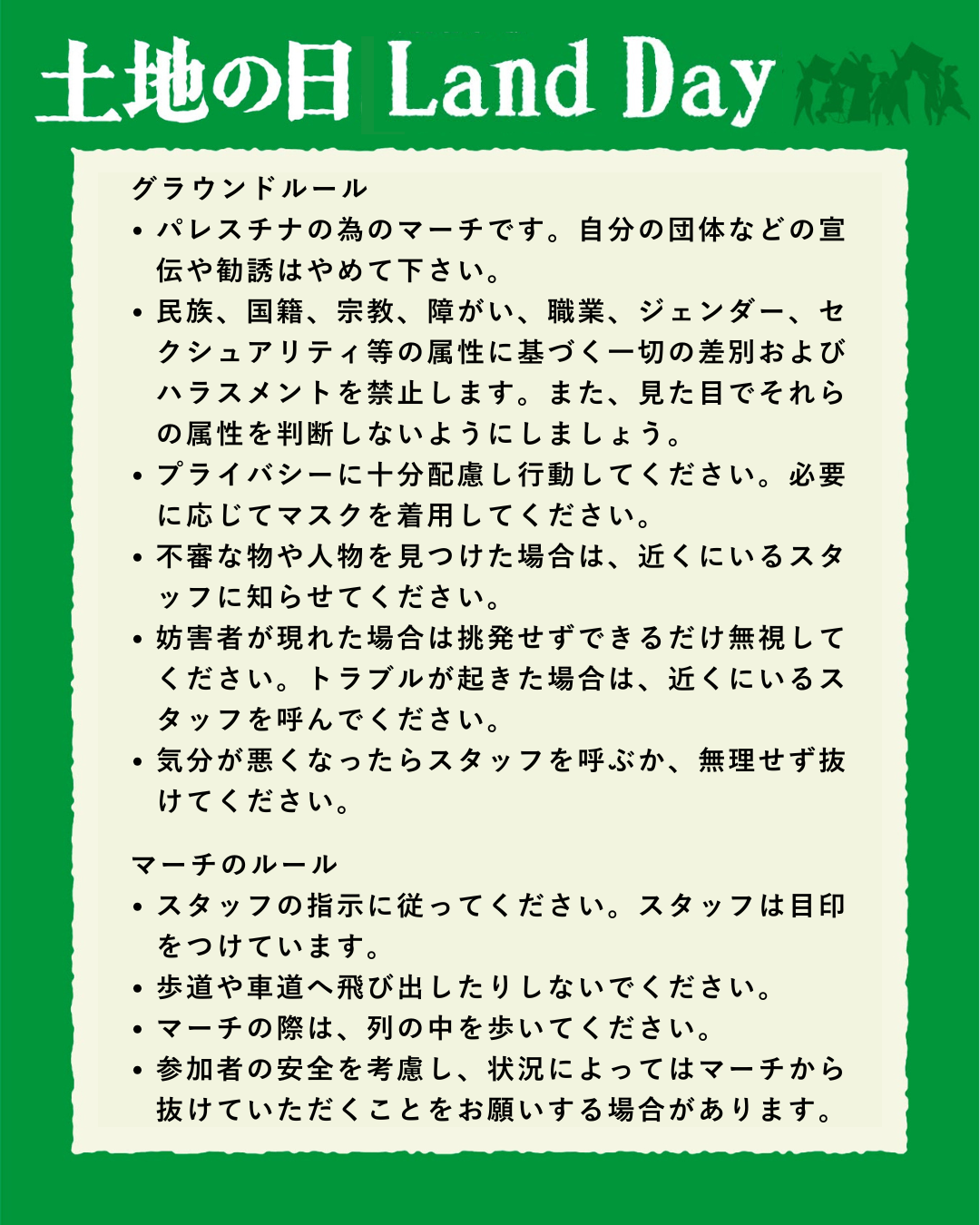 グラウンドルール:パレスチナの為のマーチです。自分の団体などの宣伝や勧誘はやめて下さい。民族、国籍、宗教、障がい、職業、ジェンダー、セクシュアリティ等の属性に基づく一切の差別およびハラスメントを禁止します。また、見た目でそれらの属性を判断しないようにしましょう。 プライバシーに十分配慮し行動してください。必要に応じてマスクを着用してください。不審な物や人物を見つけた場合は、近くにいるスタッフに知らせてください。妨害者が現れた場合は挑発せずできるだけ無視してください。トラブルが起きた場合は、近くにいるスタッフを呼んでください。気分が悪くなったらスタッフを呼ぶか、無理せず抜けてください。