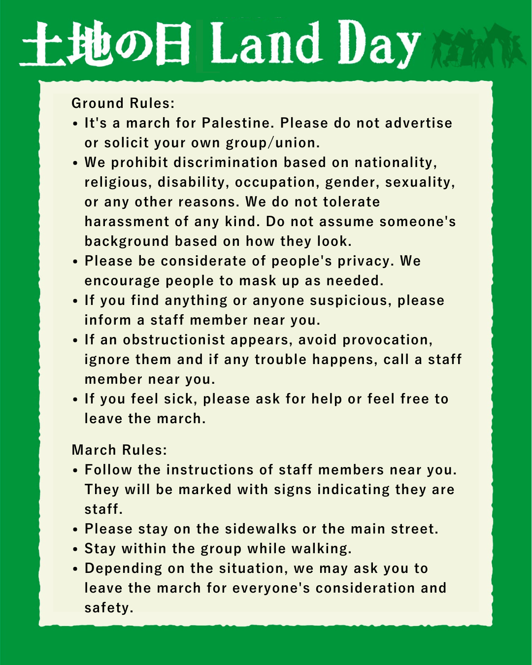 Ground Rules: It’s a march for Palestine. Please do not advertise or solicit your own group/organization. / We prohibit discrimination based on nationality, religion, disability, occupation, gender, sexuality, or any other reasons. We do not tolerate harassment of any kind. Do not assume someone’s background based on how they look. / Please be considerate of people’s privacy. We encourage people to mask up as needed. / If you find anything or anyone suspicious, please inform a staff member near you. / If an obstructionist appears, avoid provocation, ignore them and if any trouble happens, call a staff member near you. / If you feel sick, please ask for help or feel free to leave the march.
