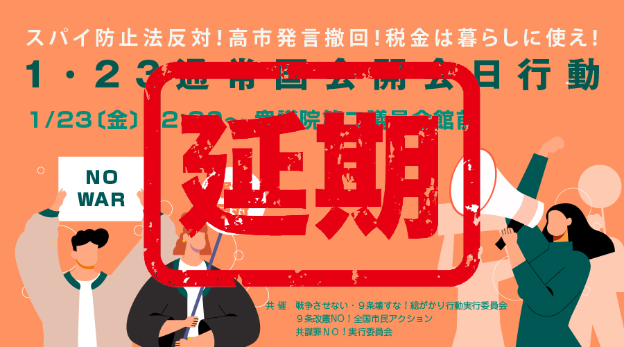 高市首相が、通常国会冒頭で衆議院解散を行う意向とのことで、1・23通常国会開会日行動は延期することにします。よろしくお願いいたします。